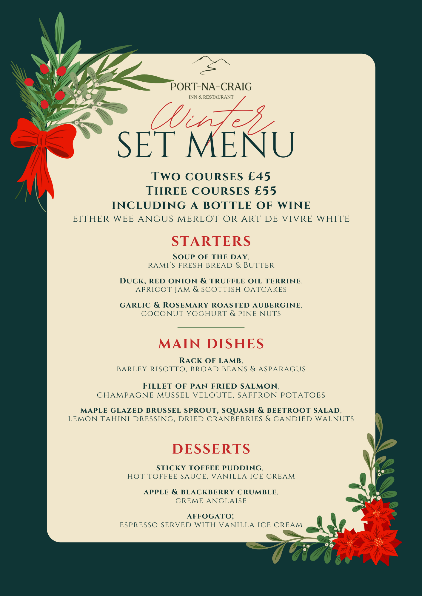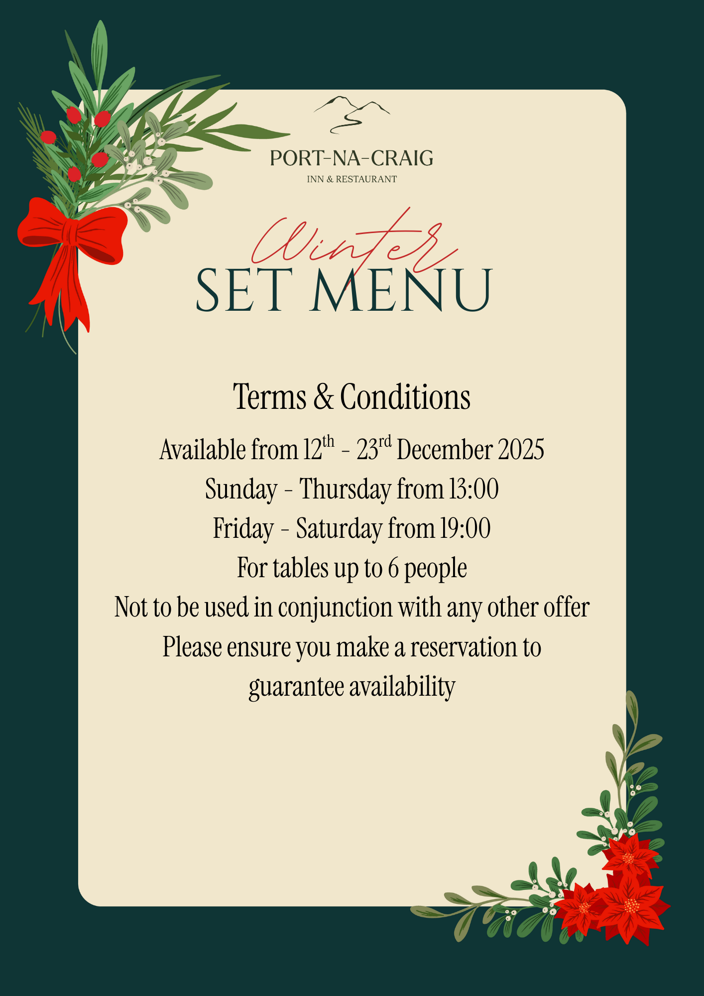 PLEASE EMAIL reservations@portnacraig.com or call 01796 472777 to reserve your table